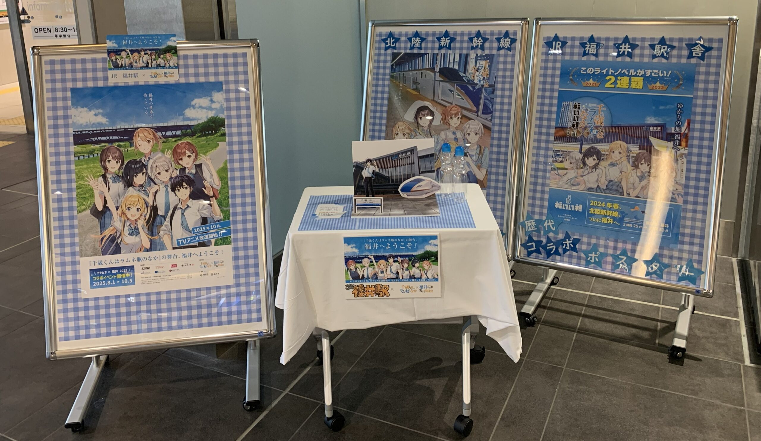 福井駅でも福井のご当地アニメのパネルを見ました。テクノフェアの会場にいた地元テレビ局のブースでもこちらのアニメが前面に押し出されていたので、色々お話を伺ったところ、こちらの作品は福井出身の作家さんが実際に有る2つの高校の名前の文字をとった架空の学校を舞台に、実際の校舎や福井の風景を描いているとの事で郷土愛の強い作品のようでした。