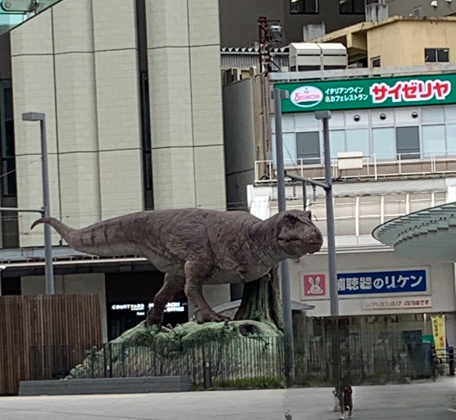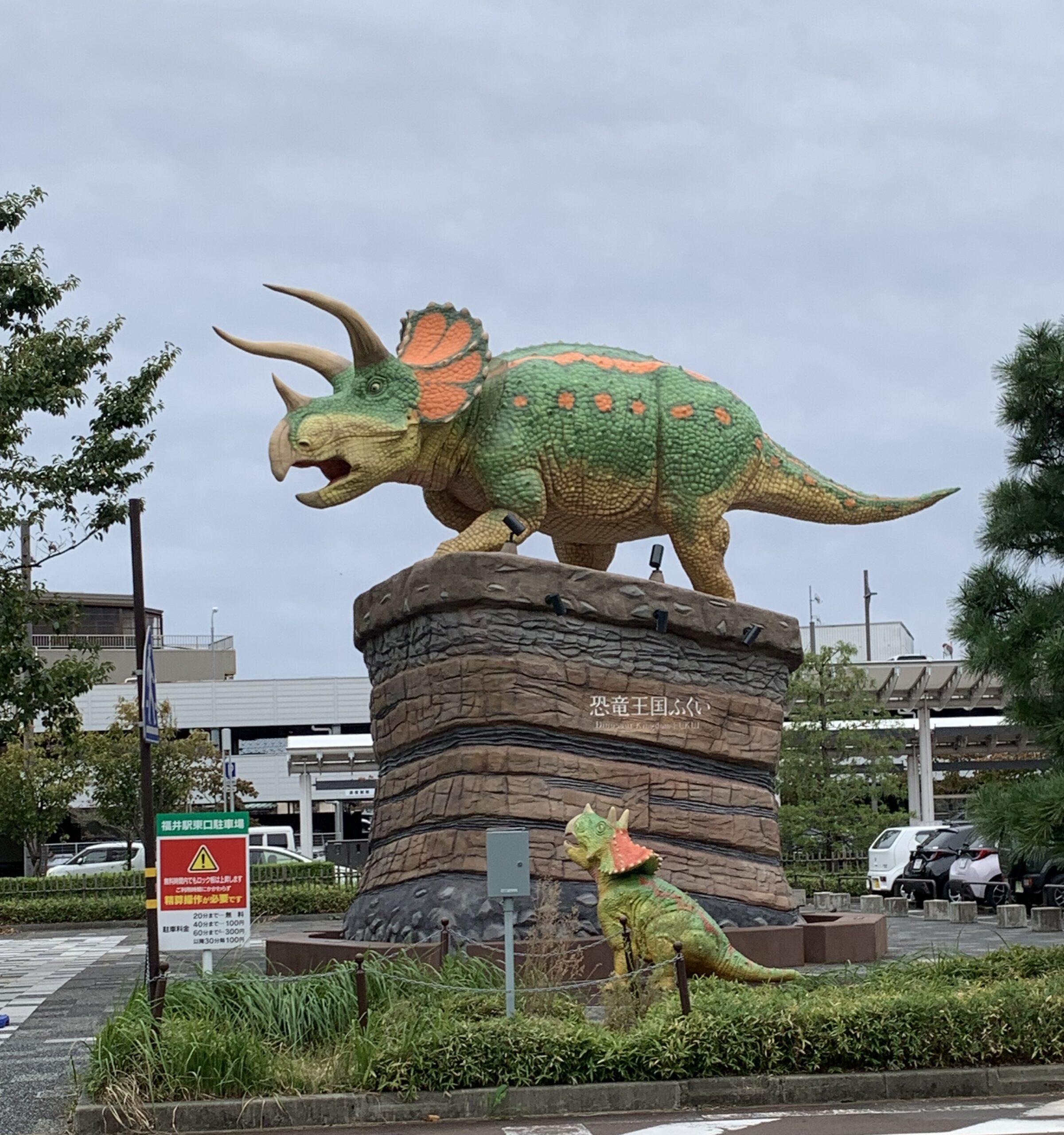 福井駅前にもたくさんの動くリアルな恐竜がいて、駅からトリケラトプスとティラノサウルスをみたのですが他にもロータリーには、たくさんの恐竜がいました。