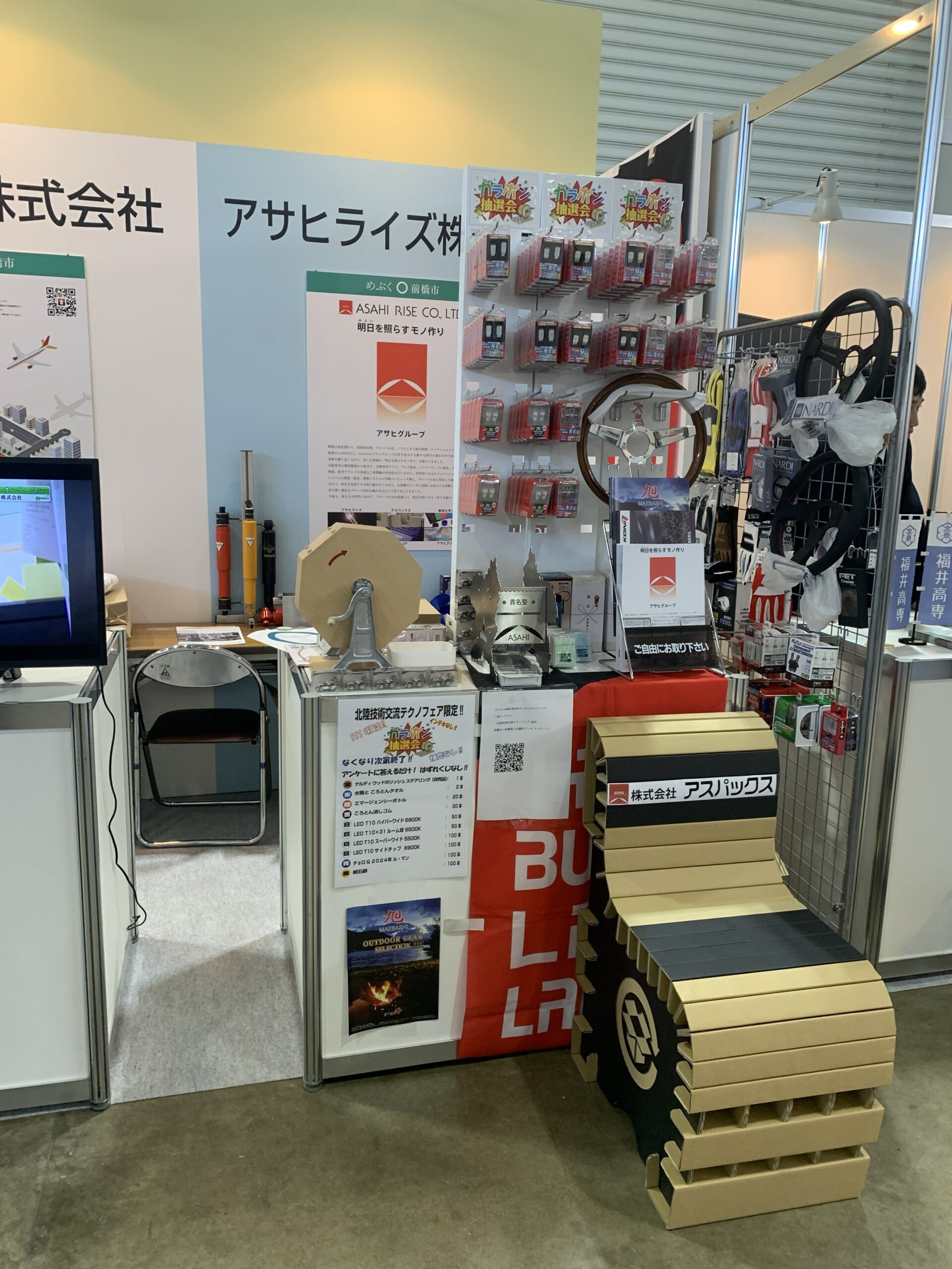 もう片方の隣のブースは、グループ企業の製品をたくさんお持ちになっていて、段ボールで作られた椅子がとても丈夫な作りで形もオシャレでした。グループ会社で自動車関連メーカー製品の正規輸入取り扱い事業をされているとの事で、アンケート回答者に景品付きの抽選会をしてお客さんを呼び込んで会社PRをされていました。魅せる展示方法を勉強させて頂きました。