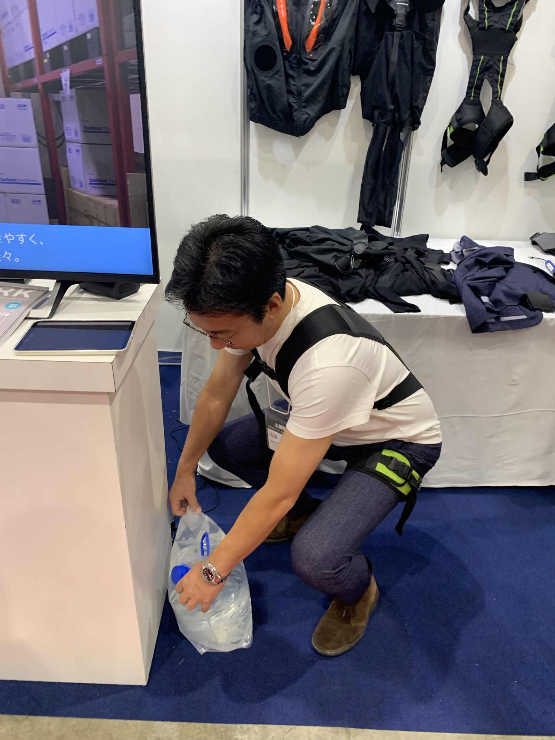 前橋ブースの他にも会場内に福井をはじめ全国から集まるたくさんの企業ブースを巡りましたが、鋼材や鉄板加工等で重量物を持ち運ぶことが多い工場作業用にパワーアシストスーツを社長自ら体験して頂いて効果を確認したり