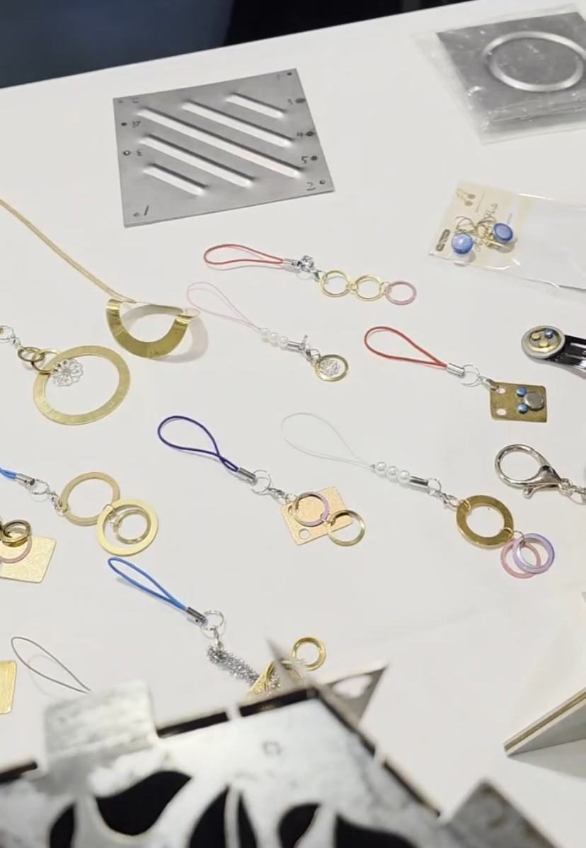 新作として、加工や切り抜きで出たリングなどの端材を使ったアクセサリーやストラップも展示されていましたが、とても端材とは見えない仕上がりでした!!!とても素敵なSDGsの取り組みだと思います。 見学に来ていた女子高校生さんがこちらのストラップに興味を持ってお話を聞いていました。